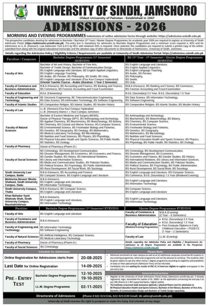 University of Sindh Jamshoro has announced admissions for 2026 in Morning and Evening Programmes. Apply online for undergraduate and postgraduate degrees in Arts, Business, Education, Law, Pharmacy, Engineering, Natural Sciences, Social Sciences, and more.