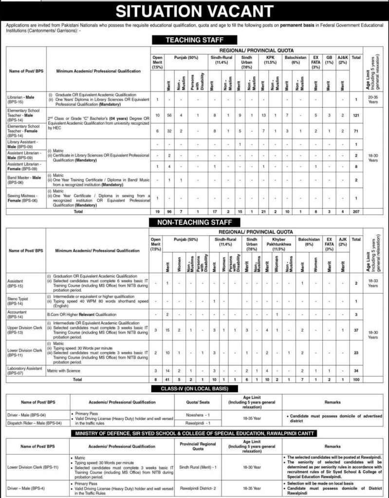 The Ministry of Defence has announced Situation Vacant 2025 with 380+ teaching and non-teaching vacancies in Federal Government Educational Institutions (Cantonments/Garrisons). Apply online, review quotas, eligibility, and secure your government career today.