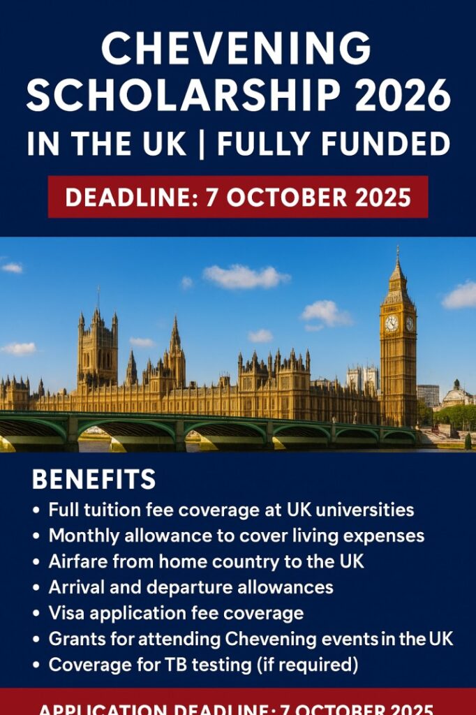 The Chevening Scholarship 2026 in the UK is a prestigious, fully funded program for international students, offering tuition fees, monthly allowance, airfare, visa coverage, and more.